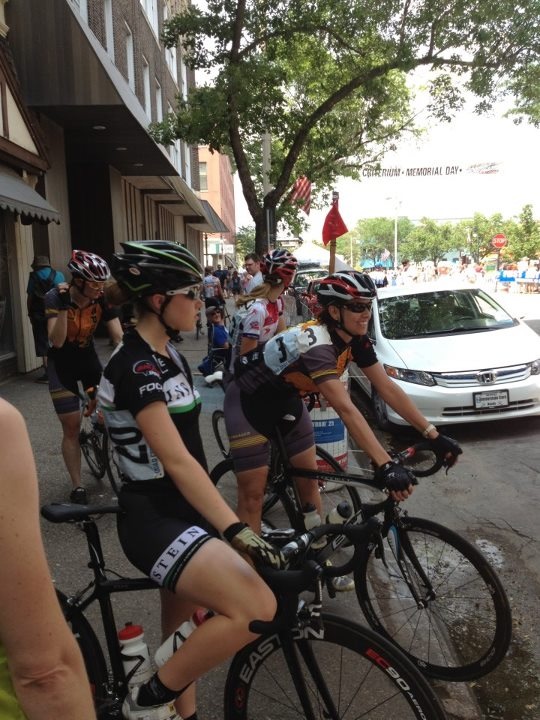 Stage 4: Minneapolis crit. Minneapolis would be the “easy” day. Big teams would protect their GC contenders and shut down strong moves to keep them fresh for Menomonie. Here we were told to be opportunistic if the opportunities came but first and foremost to make sure that Anna (now our GC leader) was comfortably in there. There were a lot of people cheering around all parts of the course, media coverage, etc. We zipped up our jerseys and paraded two-by-two to sign in, cameras everywhere. Gave pre-race interviews. Lined up for more photos. I heard someone yelling from inside an apartment “Sarah RICE! Sarah RICE!” What? It was Gant Luxton, the first grad student who I worked with at Northwestern. He saw me getting my picture taken and ran out and chatted with me during warm-up. Jenn told me to FOCUS (she’s right that I have an issue with this), but it was hard. I got excited and over-warmed up for the heat that day and for the miles I had in my legs. For the race I had my brother and sister-in-law Paul and Anaya near the start, Dick Cooley on turn 1, Gant on turn 2, and Lynn Keillor, the Directeur Sportif of Kristen Meshberg/Sarah Rice at Speed Week, on turn 3. Normally I don’t hear people cheering but I did in Minneapolis and it was great- Anaya’s “gosh!” followed by Cooley’s Wisconsin accent “Gooooh Syaraaahh”, Gant giggling “she’s doing WELL!”, and Lynnie’s “KINKYLINKER!” every lap. I concentrated on good corners and saving energy as my legs felt a little dead. In one corner I was going a little outside to inside while Mia Loquai of ISCORP was going a little inside to outside, and we locked up in the middle- full contact, handlebars, shoulders, hips all touching. While we took the corner like that I told her, “We’re OK, you’re a good rider, I’m a good rider, we’ll keep it up, see, GREAT!!” and we separated. WHEW. Close one. Later in the race, TIBCO had Shelley Olds off the front and the others were pinching the field in the final corner every lap to block. When I saw Carmen Small fail to break through their blockers, I thought this might not be the day to try to make something of it. Anna could win the amateur jersey if I helped in Menomonie, and she didn’t need help here. So every lap I positioned well mid-pack, lost a few wheels as the pace picked up before the last corner, and drove right back in there when TIBCO pinched. It was lame, but very easy. I was disappointed with my mid-pack 35th place finish, telling my coach and Jenn “but I didn’t race my bike!” as they insisted that I’d been smart. In retrospect, they were right. I rolled around with Mia a little after the race, apologizing for the lock-up. She said that was as much on her as me, and that my encouragement instead of the usual panicked cussing one gets helped her to keep it upright. The incident was a mistake, no doubt- we both took a bad corner. But with the right attitude you can make a friend while making a mistake. Good to know.