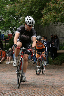 It is what they all say it is and more. Do I look like I am having fun. I do not even know where to start with this beast. I was nervous from the time Nick (BR) and I left the city. First look at the course did not help the situation. Once on the bike and a warm up lap up the snake, things started to feel better. I was a lot more confident and did not think it would be that bad. That was the beginning of the end. Started on the front row, and immediately did everything I set out to do wrong. (common theme for the weekend). Slipped a pedal on the start, bad, did not get out front on the first corner, bad, got stuck in the middle of a mess heading up the 1st lap of the snake, bad, did not bomb the downhill to make up for the error, bad. Heading into the snake for the second lap, I look up to see Peter from XXX going ape shit off the front and leading the pack up the bricks. At that point I was just looking to hang on for a few laps in hopes that the field would slow and I could begin to make up some spots. 6 laps in and I am dying but still hanging on. Nick is in sight and I am starting to feel better, 2 more laps and things no longer look so good. Brian another xxx tries to bring me along with him on his move but I have nothing, and at this point I was just trying to finish, which I did (20th). At least I got that going for me considering that only 27 of the starting 60 did that. Peter finished 5th, Brian 9th and Nick 12th. Average heart rate, 184!!! Lesson for the race, learn how to ride downhill at high speed.
