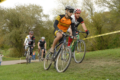 We got out to DeKalb around noon because we didn’t pre-register and there were only 10-20 spots left in the 4B’s and 4A’s was filled. Luckily we registered with 10 spots remaining. After pre-riding the course and warming up we went over to the start area around 2:45 along with the other 70+ 4B’s. They called up the top ten finishers from Jackson Park, Austin from RVB was going to take Cushman’s 8th place spot since Dave was out of town .. They called the rest of us up and I got a spot in the 2nd row on the far right, which was ideal since about 30 yards down there was a hard left hand turn. Shea and Austin were right behind me. Start whistle goes and I make it to the turn pretty close to the front and through the first couple of turns I see there’s about 5 people in front of me, Chase Wolford from Rhythm Racing (rides for IIT too) is in the lead. Heading out to the baseball fields and the off-camber twist and turn I realized I couldn’t hold my current pace and had to back off a little. On the first pavement section I hear someone coming up and cheer me on and I see out of the corner of my eye it’s an RVB’er and I’m like, “go, go, I can’t keep up ..” and Austin flies by me. Somewhere near the start of the 2nd lap as my lungs are screaming and my legs are going unresponsive I see a monkey kit coming up and I shout, “come on Shea, get up here!” He eventually did and then passed me. I kept Shea in my sights and we got to cheer each other on through the multiple switchback sections. Overall, after sitting pretty good in 6th in the first 5 minutes of the race, I lost 6 more spots and ended up in 12th. Shea did great and got 9th! My lungs still hurt, but I’m still smiling by how much fun it was and how well Shea did.